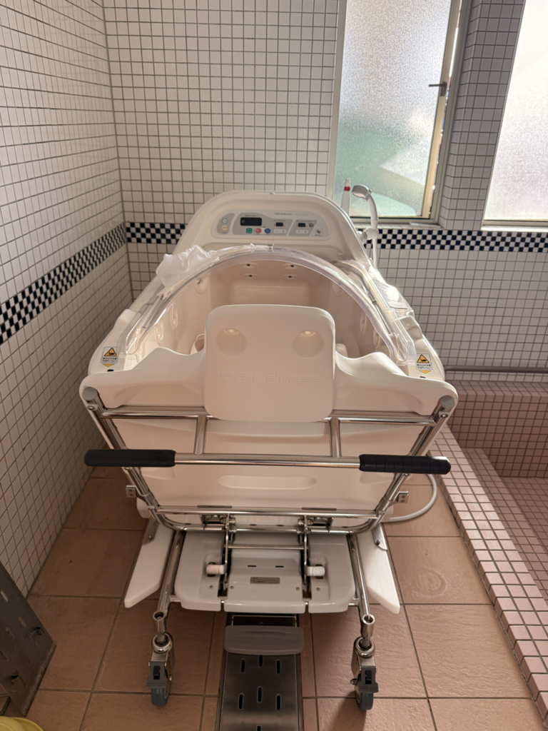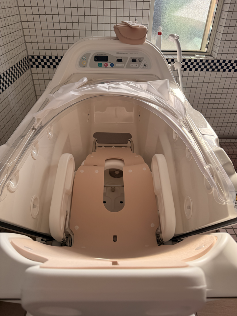 従来の機械浴は車椅子のような専用の椅子に座ったまま入浴することが出来る特殊浴槽でしたが、今回は機械浴全体からミストシャワーが出る機械浴を導入しました!